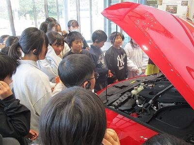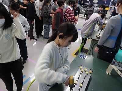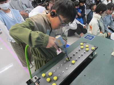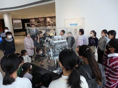 自動車の生産ラインや、環境に配慮した工程の説明を受けてから、エンジン組立工場を見学しました。工場の体験コーナーでは、ボルトの取り付けや部品の受け取りの作業を実際に行いました。