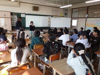 3年生の外国語活動。英語専科の先生から提示された動物の特徴を英語で伝えて、何という動物かを当てるゲームです。みんな、積極的にヒントを出していました。