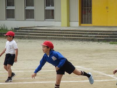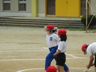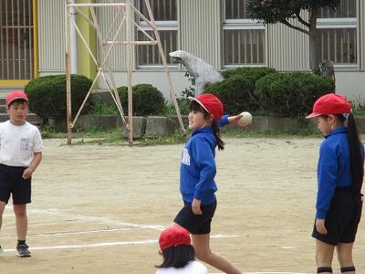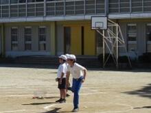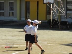 6年生がソフトボール投げの記録をとっていました。