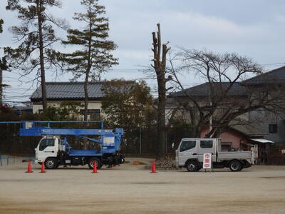 業者の方による校庭の木の伐採と剪定作業が行われています。