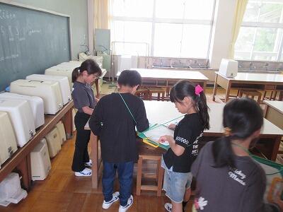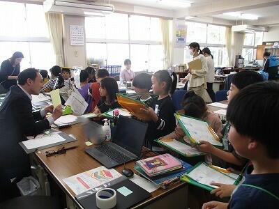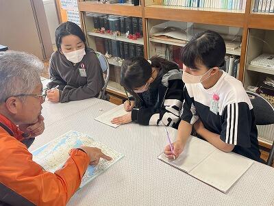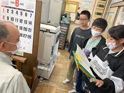 校長室では「宮田小の歴史で一番のハプニングはなんですか?」「なぜ“自分から”と“ともに”何ですか?」などの質問に、校長先生がいろいろな資料を出して答えていました。
