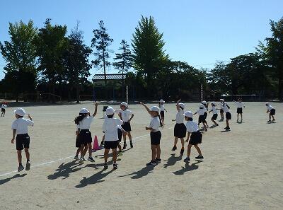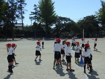 1年生が「玉入れ」の練習中。籠があることを想定して、動きを確認していました。