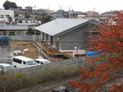 久しぶりの雨模様。風流物収蔵施設の工事は順調です。搬出入用のたたきの設置が進んでいました。日立市からの情報では、予定通り3月完成予定とのことです。
