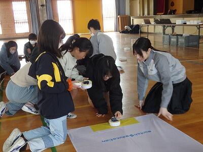 『マイクロBITに「進み方」のプログラムを組み込み、カーリング・ロボットを的の中心まで自走させる』ことを目標に、学生さんたちからアドバイスをいただきながら取り組みました。
