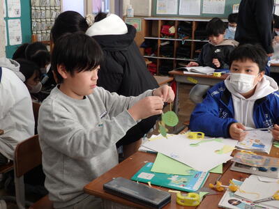 てこの原理(支点・力点・作用点)をもとにモビールの制作に取り組んでいました。