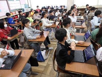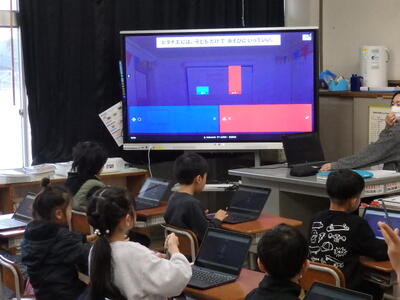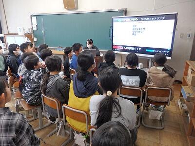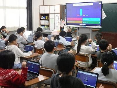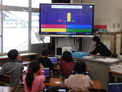 1年生は、タブレットを使って冬休みの約束や、2学期の復習を行っていました。早押しで全員分が集計され、電子黒板に結果が表示されていました。