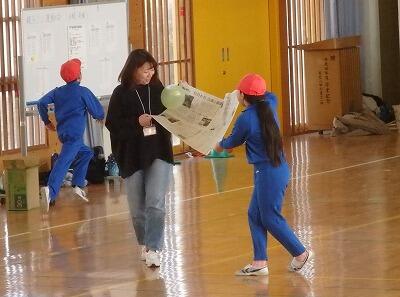 次は風船リレーです。新聞紙と風船に悪戦苦闘!
