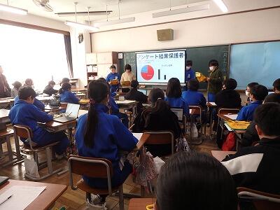 アンケート調査の結果や地域防災の状況から、どんな防災バックを準備しておけばよいのかを発表しました。調査結果をグラフィック化するなど、工夫がたくさん見られました。
