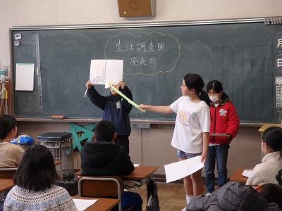 4年生国語、アンケート調査の結果を考察して、みんなの前で発表していました。