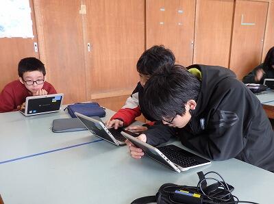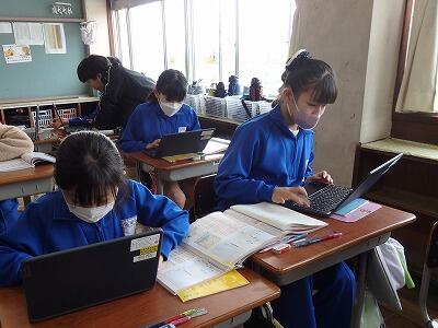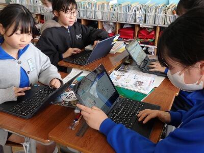 5年生は、社会科の授業でまとめの新聞づくりです。こちらもタブレットを使って作業を進めていました。