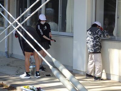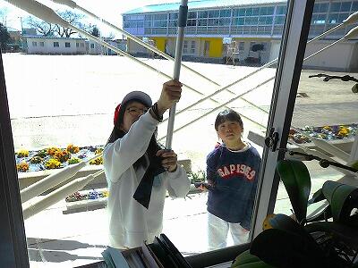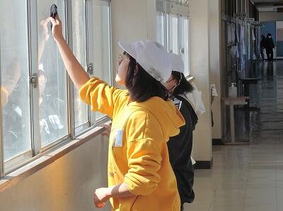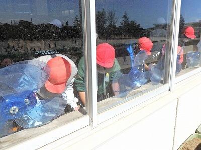 校庭から吹き付ける土ぼこりで汚れた窓を、一生懸命に磨いてくれました。窓の枠にたまった汚れも拭き取っていました。