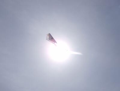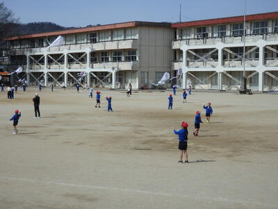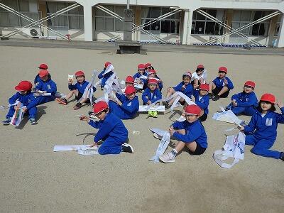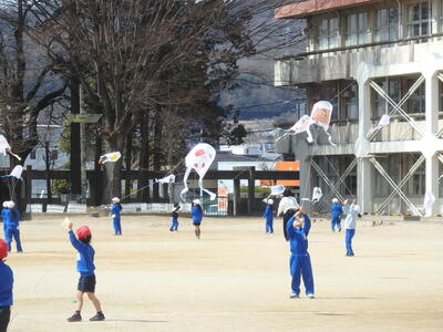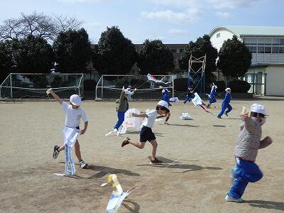 そこで、「風車の時を思い出してみよう」と問いかけたところ、たこに風があたる向きで揚げたらいいのでは、という考えが出てきました。今日は北東の風。風を受けられるようにたこを揚げたところ・・・